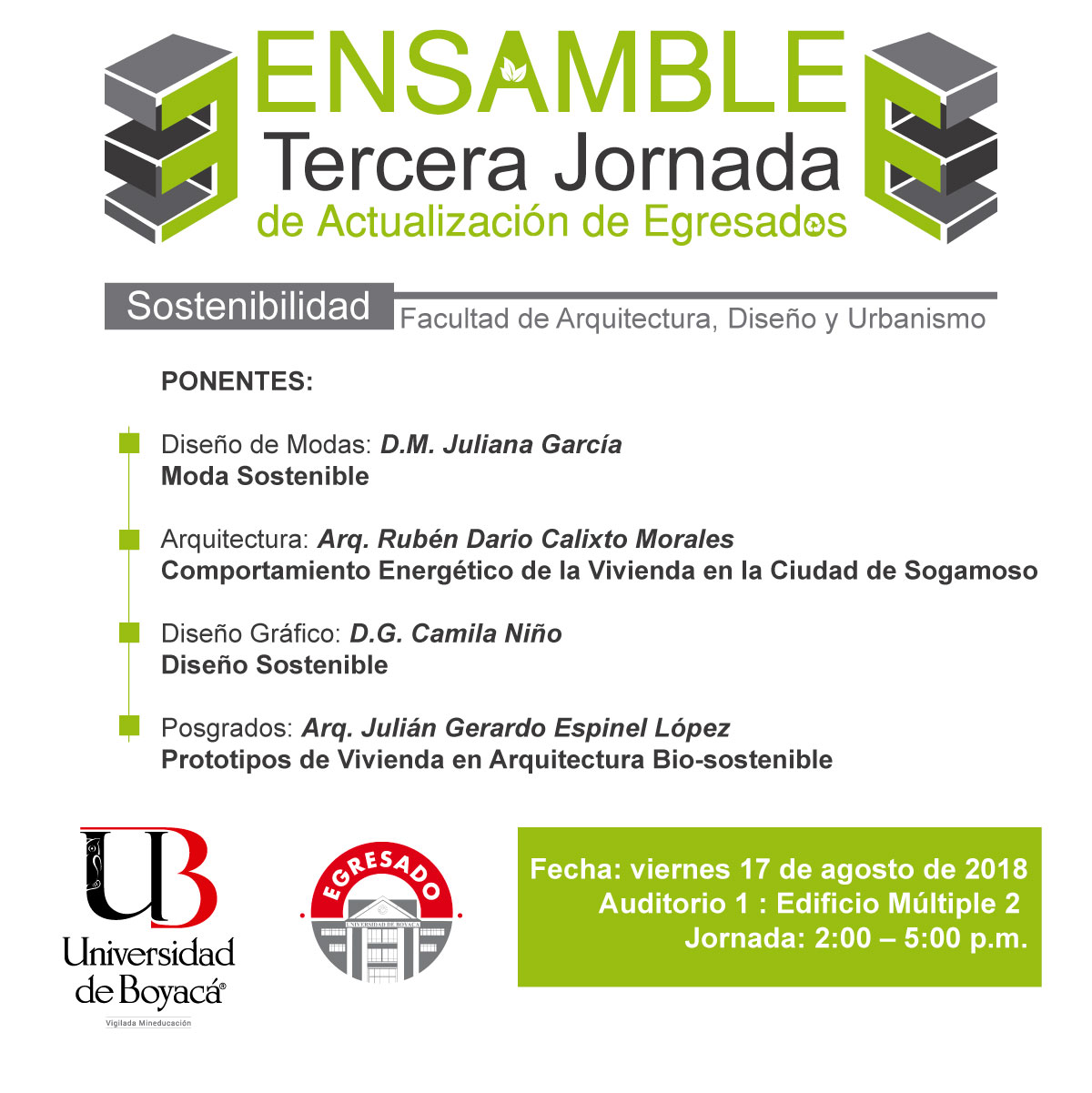 En esta oportunidad, la jornada de actualización se encuentra enmarcada en el campo de la sostenibilidad, por esta razón tres de nuestros egresados de pregrado y uno de posgrados realizaran diferentes ponencias dando a conocer sus proyectos, tanto en el ámbito académico como en profesional.