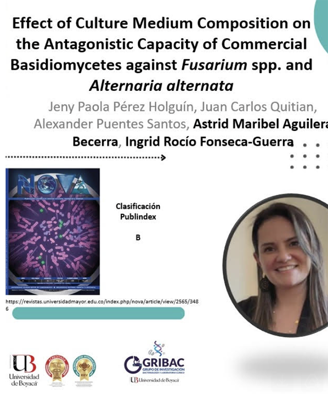 La egresada de Bacteriología y Laboratorio Clínico y docente del programa académico, Astrid Aguilera Becerra, continúa consolidando su trayectoria investigativa desde la línea Salud y Bienestar Integral con la publicación de su más reciente artículo: “Effect of Culture Medium Composition on the Antagonistic Capacity of Commercial Basidiomycetes against Fusarium spp. and Alternaria alternata”. El estudio, divulgado en la Revista Nova, analiza el comportamiento de hongos basidiomicetos comerciales frente a especies fitopatógenas de gran importancia, aportando evidencia clave para el desarrollo de alternativas biológicas orientadas al control de microorganismos que afectan la salud ambiental y la producción agrícola. Esta investigación, desarrollada conjuntamente con la docente de la UdeB, Íngrid Fonseca, representa un avance significativo en la comprensión de la interacción entre microorganismos y destaca por su rigor metodológico, la pertinencia de sus hallazgos y su potencial aplicación en procesos sostenibles.